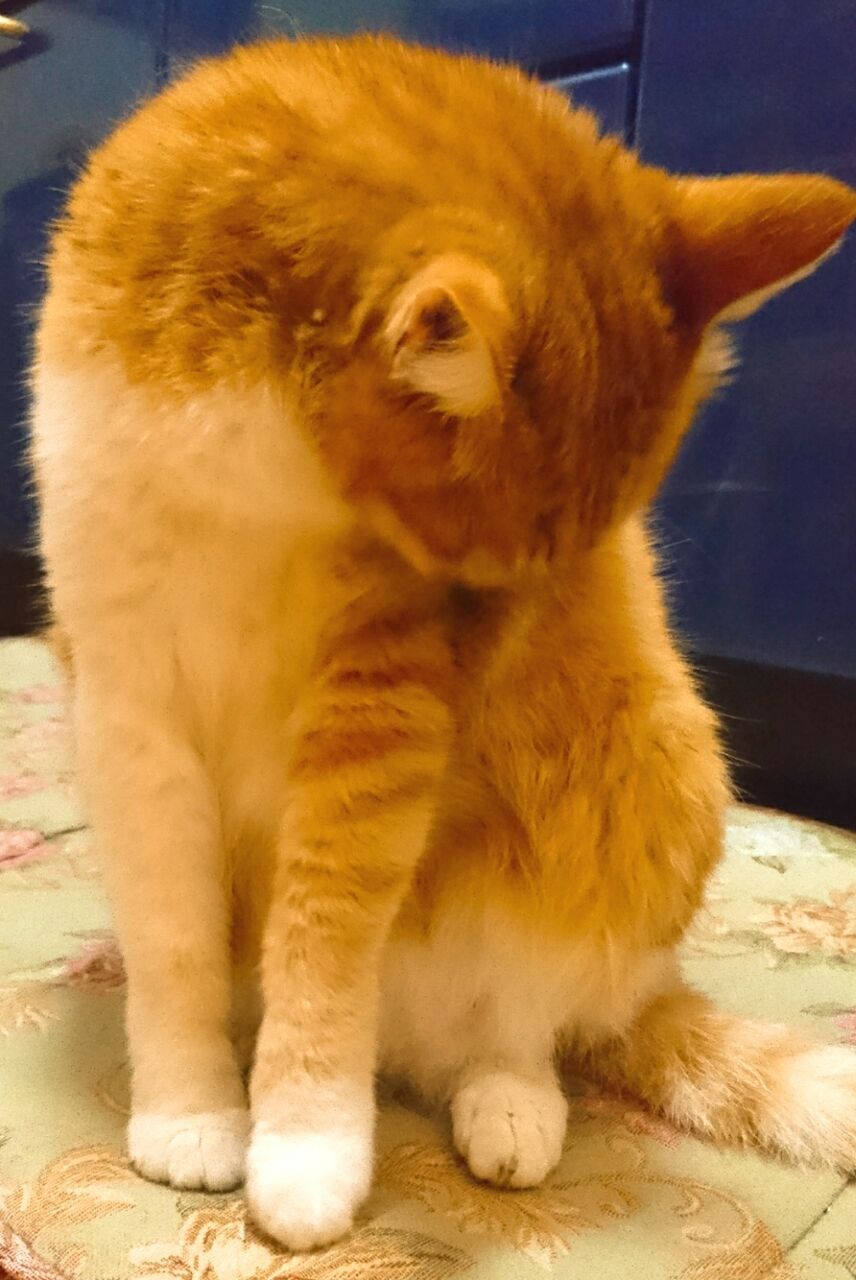体の柔軟性に自信のない人は猫のやることを真似しない方がいいですね。