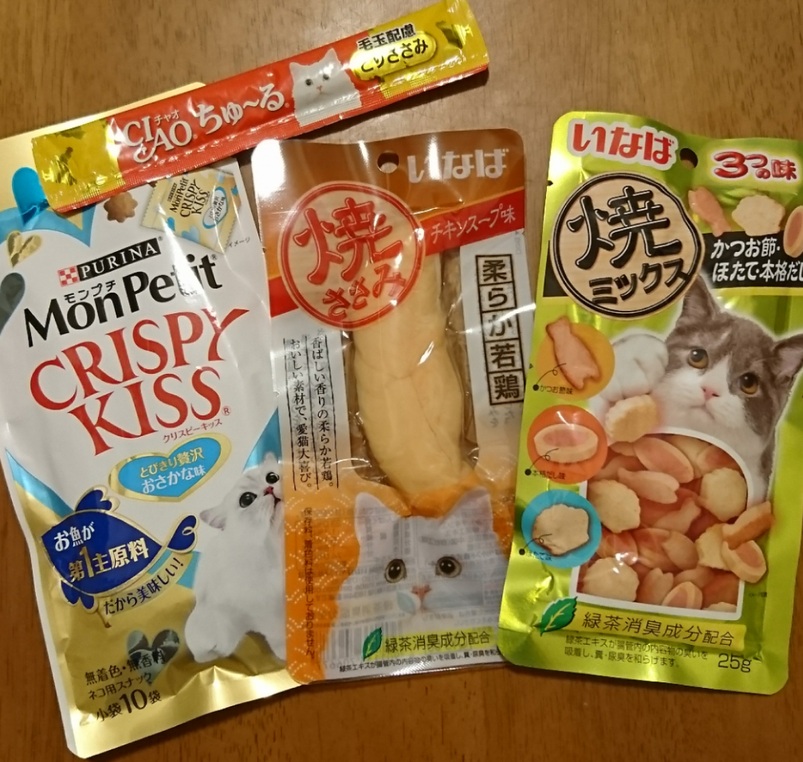 ちゅ~る、クリスピーキッス、焼きささみはまりものめちゃ好物です。
